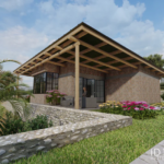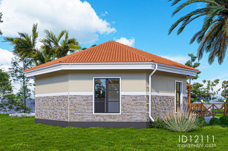 2 Room 1-Bath house plan is a compact and efficient layout. It offers a charming and cozy space for a small family or couple. The house design features a unique octagonal shape that maximizes space. It has a living area, dining space, and kitchen. There are two rooms. These rooms share a bathroom. There is also a spacious front terrace. It serves as an inviting outdoor space for relaxation, dining, or entertaining while enjoying the surrounding views. This 2 Room 1-Bath house plan covers an area of 125sqm. This excludes setbacks and parking. This style is an excellent choice for suburban or countryside living.